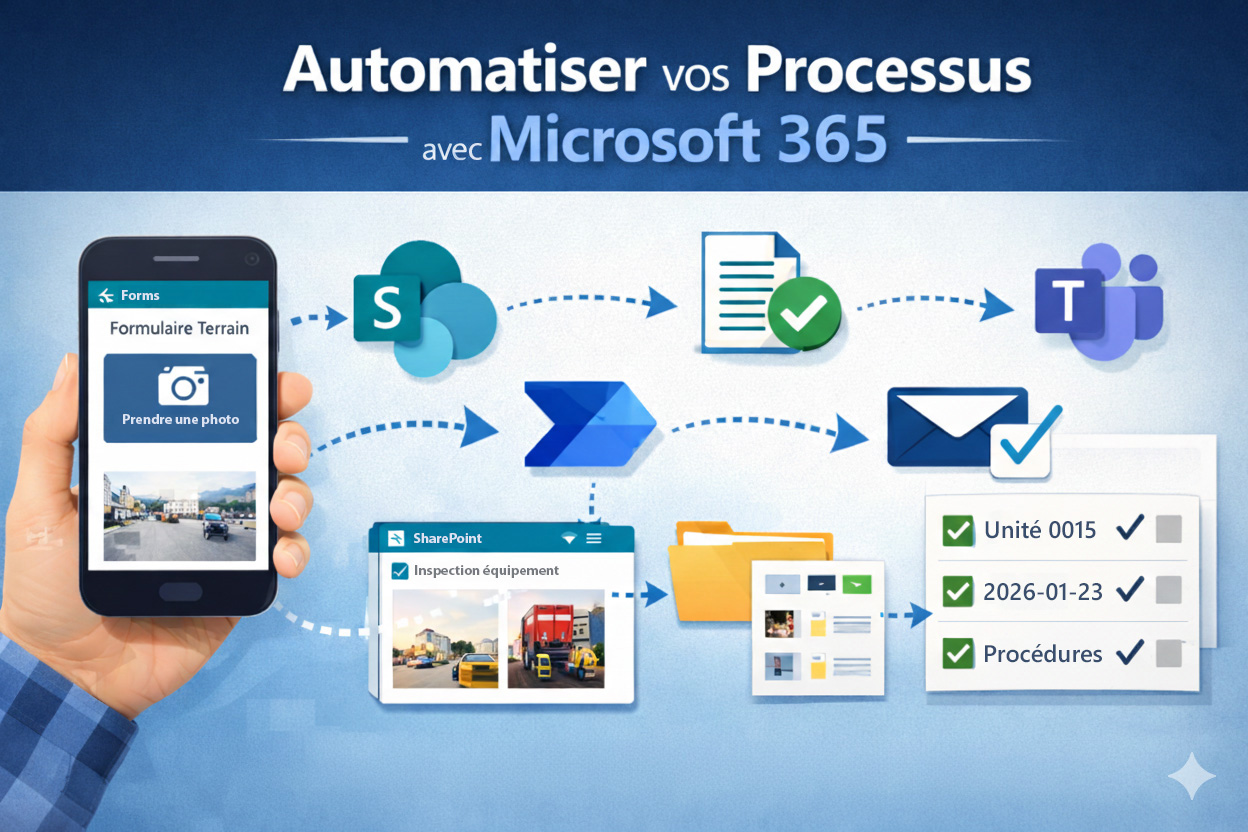 La suite Microsoft 365 offre un écosystème puissant pour automatiser les processus du quotidien, en s’appuyant sur des outils déjà en place : Forms, SharePoint, Power Automate, Teams, Lists, etc. Bien utilisés ensemble, ces outils permettent de transformer des tâches manuelles, répétitives ou mal structurées en processus clairs, traçables et faciles à maintenir.